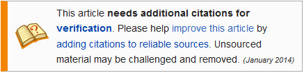 Watch out for Wikipedia content that has few to no references. Wikipedia articles that are lacking in sources (and are thus less reliable) usually come with the following warning (Wikipedia, 2014b):